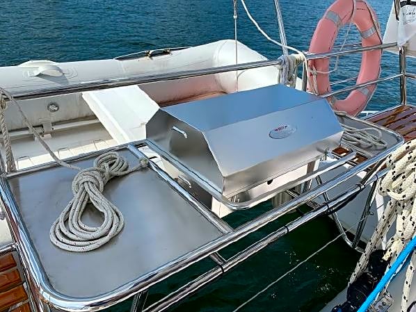 Galley 2 burner LPG stainless steel stove. Flame failure device fitted to shut off LPG immediately in event of flame going out.(option of oven) Stainless steel hot-pate BBQ grill in cockpit on the aft beam - LPG Stainless steel double sink Pressured hot and cold fresh water system Bosch on-demand LPG hot water heater Laminex galley tops, cupboards with perspex sliding front Refrigerator with attached separate freezer. 12V Eutectic system by ICEER 2 x LPG tanks Plentiful storage