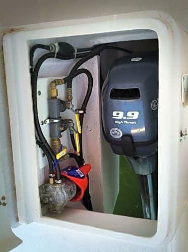 HEAD: Solid lockable door. Ash exterior finish with waterproof laminex interior finish. Electric macerating toilet Vanity basin with pressure fresh hot and cold water. Fresh water shower with flexible hand-held hose. Electric shower bilge pump with direct overboard discharge. Pipes, skin fittings and seacocks to through hull easily accessible
