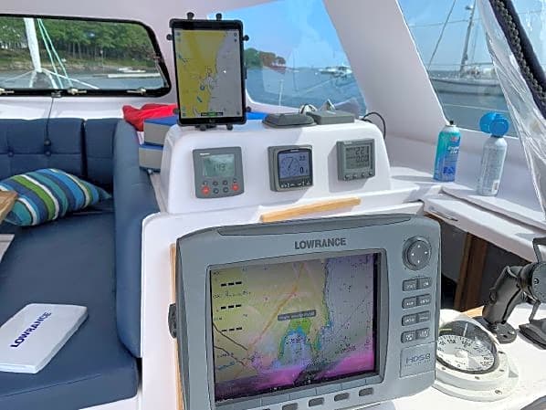 Electronics Twin steering compasses Raymarine ST60 Tridata: Log, Speed, Depth Raymar8ine i70 Multifunction Digital Instrument Display for Wind Lowrance Navico Broadband Radar BR24 Model AA01018 Lowrance Chartplotter VHF: Icom IC-M324 with masthead antenna AIS: em-trak Raymarine SPX-5 Wheel Autopilot